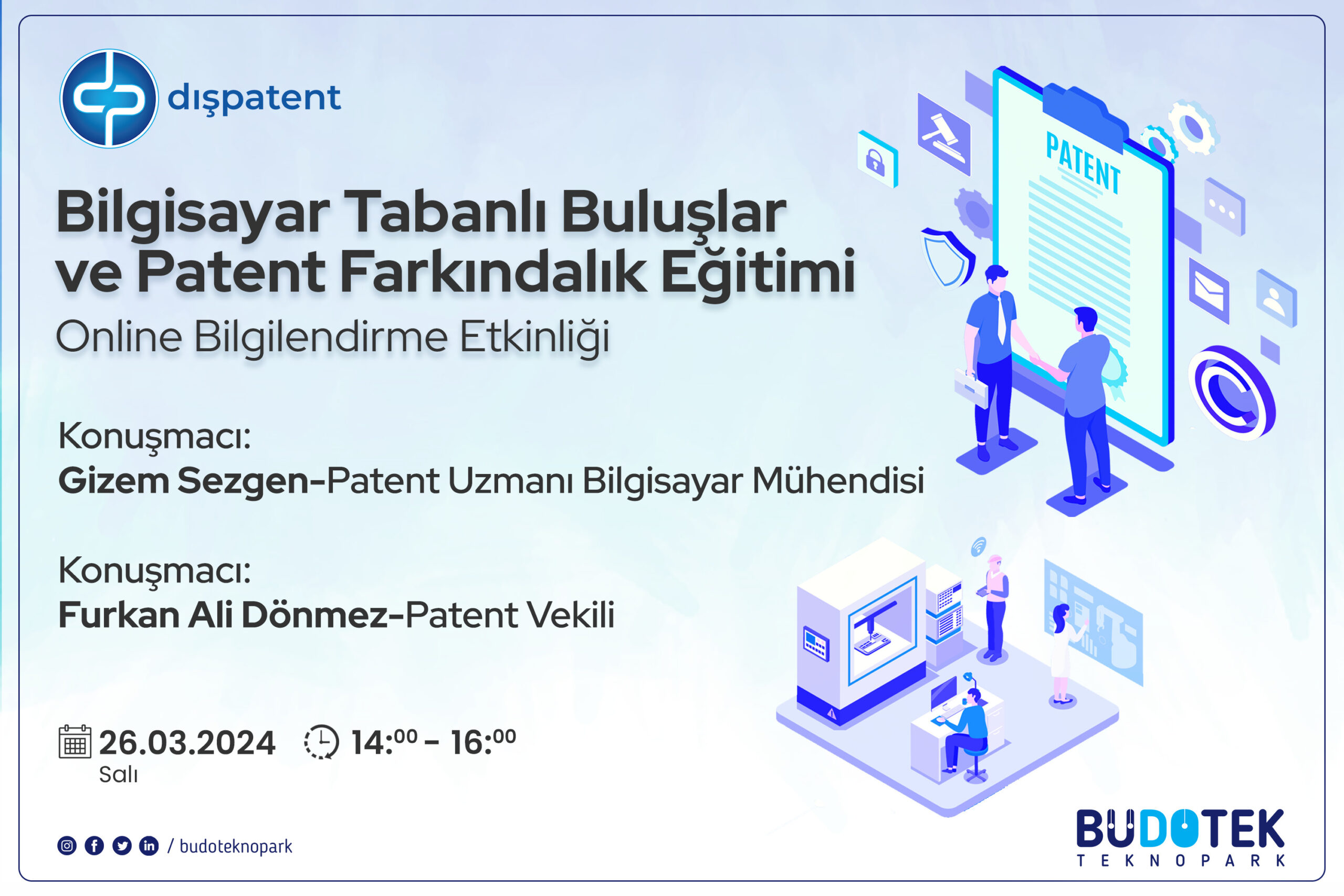 Dış Patent ile ortak olarak gerçekleştireceğimiz Bilgisayar Tabanlı Buluşlar ve Patent Farkındalık Eğitimi başlıklı etkinliğimiz 26 Mart 2024 Salı günü çevrim içi olarak düzenlenecektir.