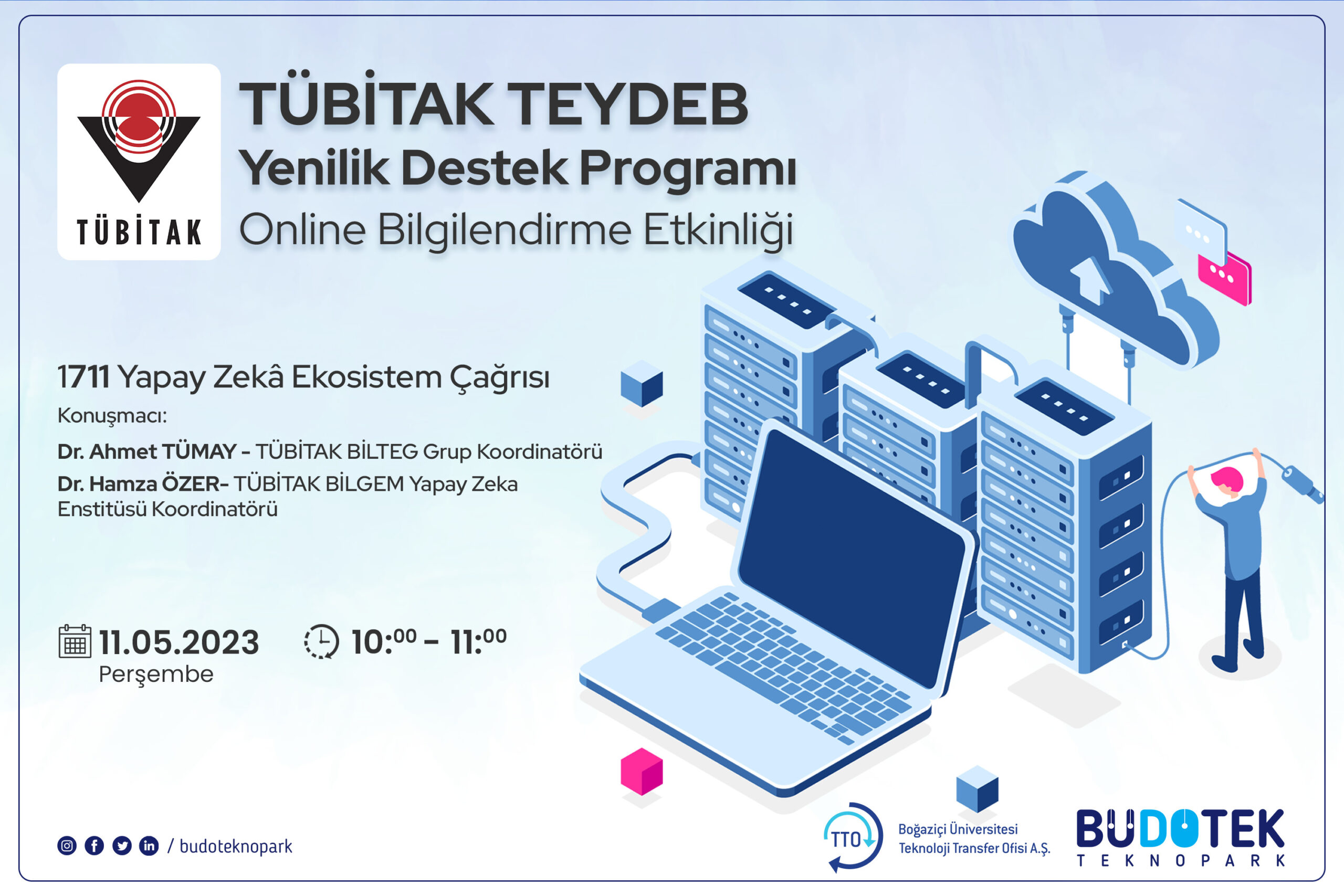 TÜBİTAK 1711 Yapay Zeka Ekosistem Çağrı dönemini açmıştır. Sizlerin yararlanabileceğini düşündüğümüz bu çağrının detaylarını paylaşmak üzere Boğaziçi Üniversitesi Teknoloji Transfer Ofisi ile “TÜBİTAK 1711 Yapay Zeka Ekosistem Çağrısı Bilgilendirme” çevrimiçi toplantısı düzenlenmiştir. Toplantıda TÜBİTAK BİLTEG Grup Koodinatörü Sayın Dr. Ahmet Tümay ve TÜBİTAK BİLGEM Yapay Zeka Enstitüsü Koordinatörü Sayın Dr. Hamza Özer çağrı hakkında bilgilendirme yapacaktır. Toplantı BÜDOTEK firmaları ve Boğaziçi Üniversitesi akademisyenleri için düzenlenmiştir.