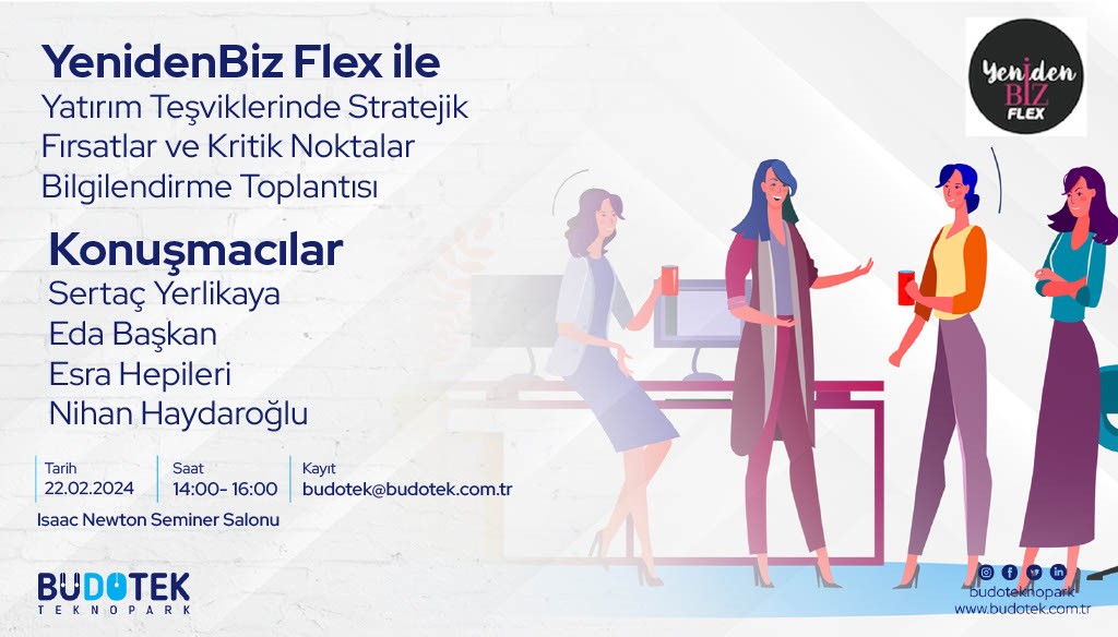 Çalışma hayatına ara vermiş kadınlara yeniden iş hayatına katılma fırsatı sunan YenidenBiz Derneğinin kurduğu YenidenBiz Flex, uzman kadrosu ile şirketlere özel çözümler sunan yeni nesil bir danışmanlık platformudur. Platform yöneticileri 22 Şubat 2024 Perşembe günü hem YenidenBiz Flex’i tanıtıp hem de “Yatırım Teşviklerinde Stratejik Fırsatlar ve Kritik Noktalar” adlı bir bilgilendirme toplantısı düzenleyecektir.  Etkinlik 50 kişilik katılım ile sınırlıdır.
