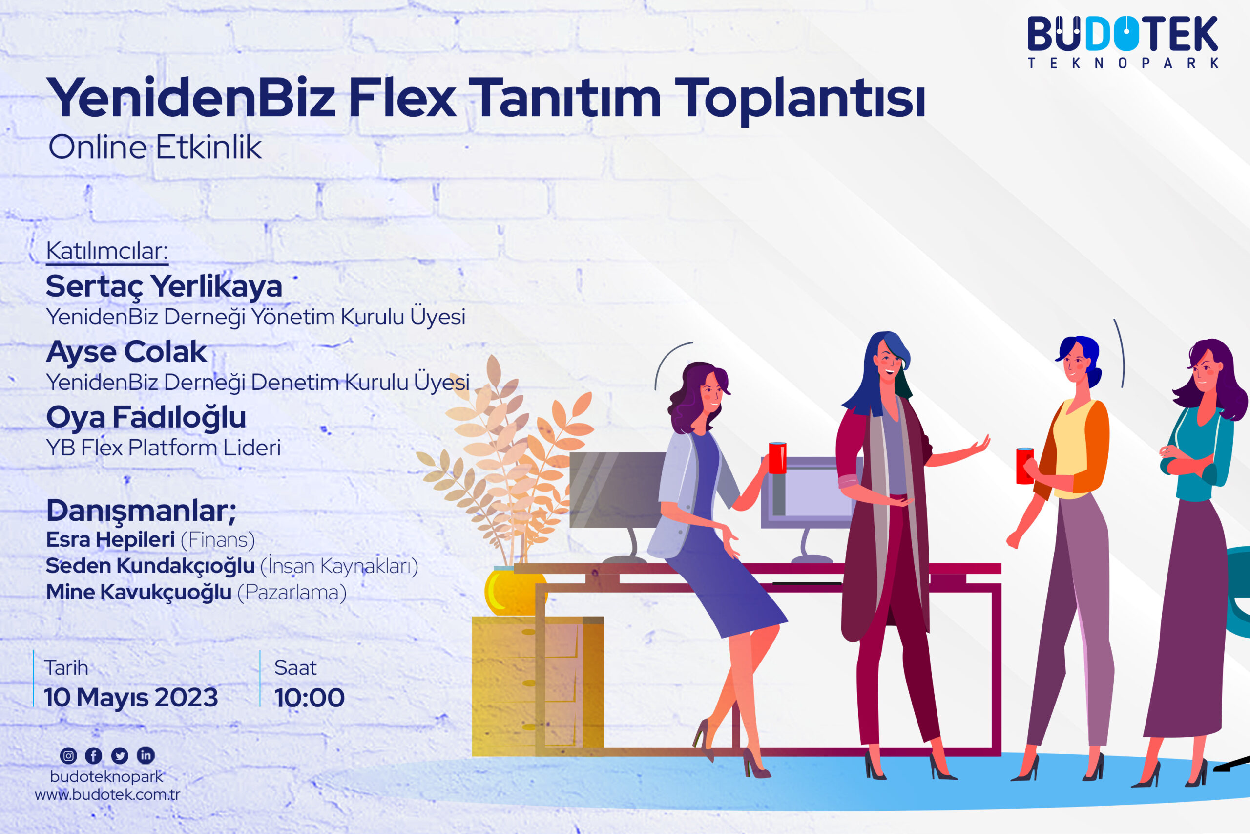 Çalışma hayatına ara vermiş kadınlara yeniden iş hayatına katılma fırsatı sunan YenidenBiz Derneğinin kurduğu YenidenBiz Flex, uzman kadrosu ile şirketlere özel çözümler sunan yeni nesil bir danışmanlık platformudur. Platformun, iş stratejileri oluşturma, e-ticaret, satış ve pazarlama yönetimi, kurumsal iletişim, finansal danışmanlık, insan kaynakları yönetimi, sürdürülebilirlik, proje yönetimi konularında verdikleri hizmetleri tanıtacağı toplantı 10 Mayıs Çarşamba günü çevrimiçi olarak gerçekleştirilecektir.
